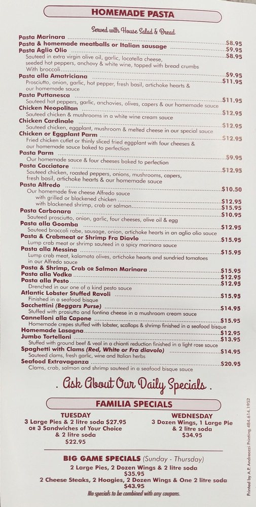 Pasta served with choice of homemade meatballs or Italian sausage. Includes side of house salad or bread.