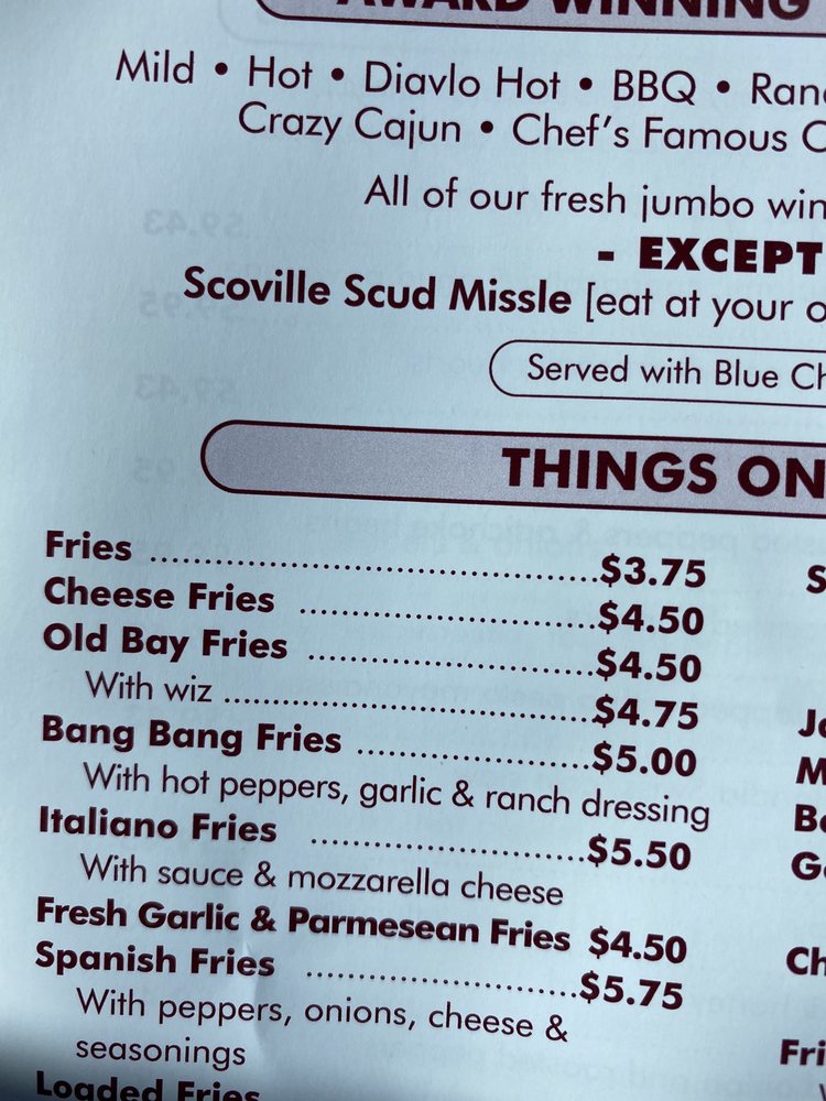 big beef dawgs deep-fried & topped with French fries, provolone cheese, & red sauce.